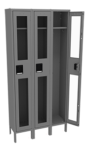 Tennsco's® Single Tier Lockers are roomy enough for just about any secured storage application. Ideal for factories, schools, hospitals and other locations where coats and clothing are stored. Clear yet strong acrylic doors offer visibility of locker contents for security reasons.